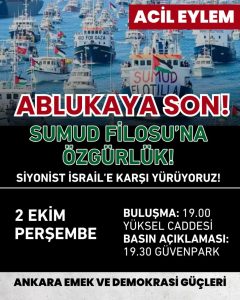 Ankara’da, “Sumud Filosu”na destek eylemi, 2 Ekim Salı günü saat 19.00’da Yüksel Caddesi’nde buluşma, 19.30’da Güvenpark’ta basın açıklaması yapılacak