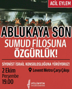 İstanbul’da, “Sumud Filosu”na destek eylemi, 2 Ekim Salı günü saat 19.00’da Levent Metro Çarşı çıkışında gerçekleştirilecek.