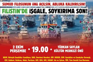 İzmir’de, “Sumud Filosu”na destek eylemi, 2 Ekim Salı günü saat 19.00’da Türkan Saylan Kültür Merkezi Önün’nde gerçekleştirilecek.